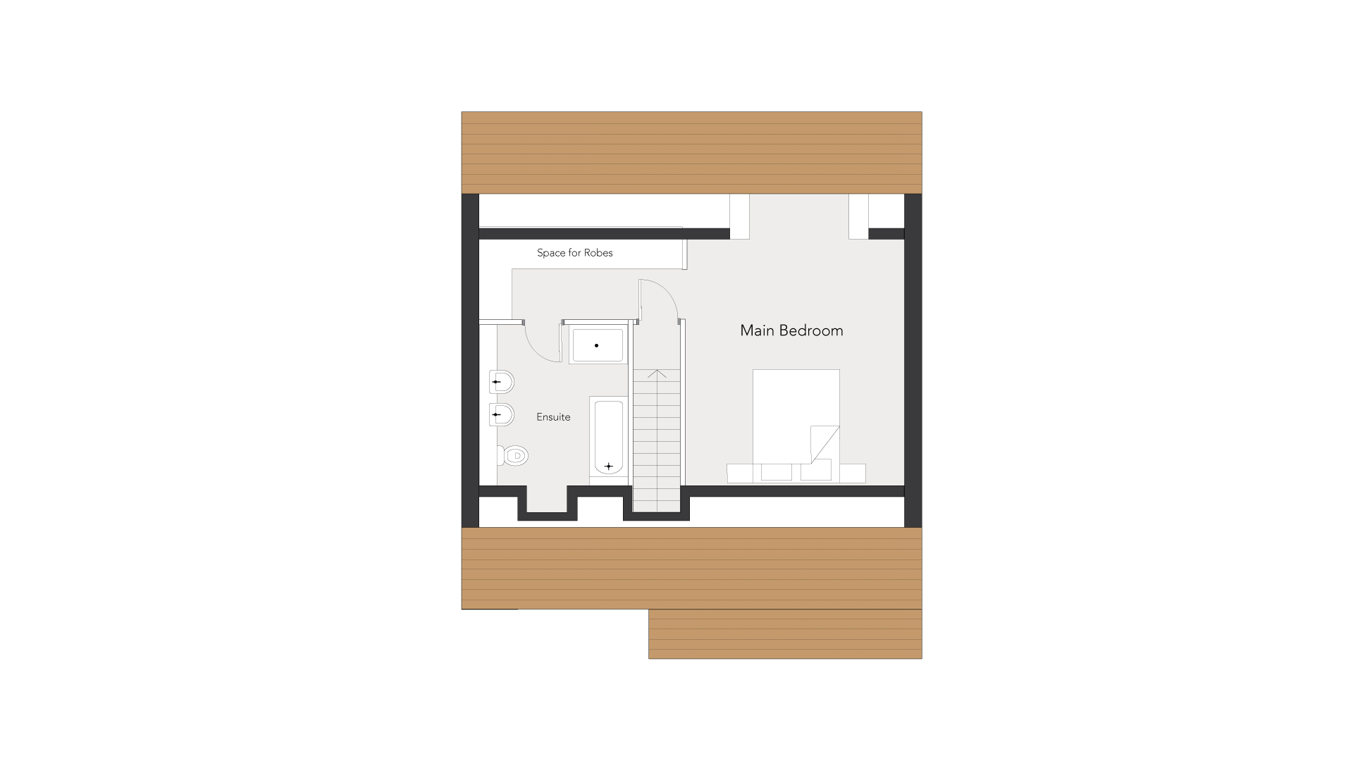 Second Floor: A luxurious master suite, featuring a spacious en-suite with a freestanding bath, a walk-in rainfall shower, and dual basins for added elegance.
