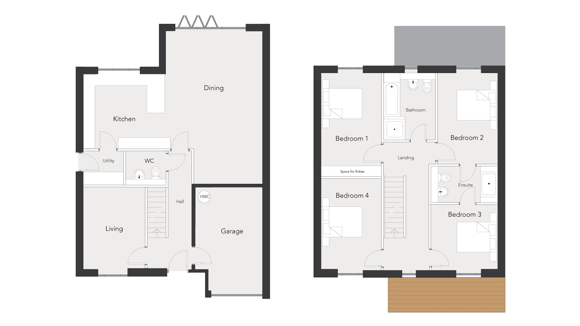 Outside: Each home benefits from a private landscaped garden with a premium paved patio and stunning countryside views. Garages include EV charging points, and the spacious driveways offer additional parking. Air source heat pumps ensure a sustainable and cost-effective living environment.