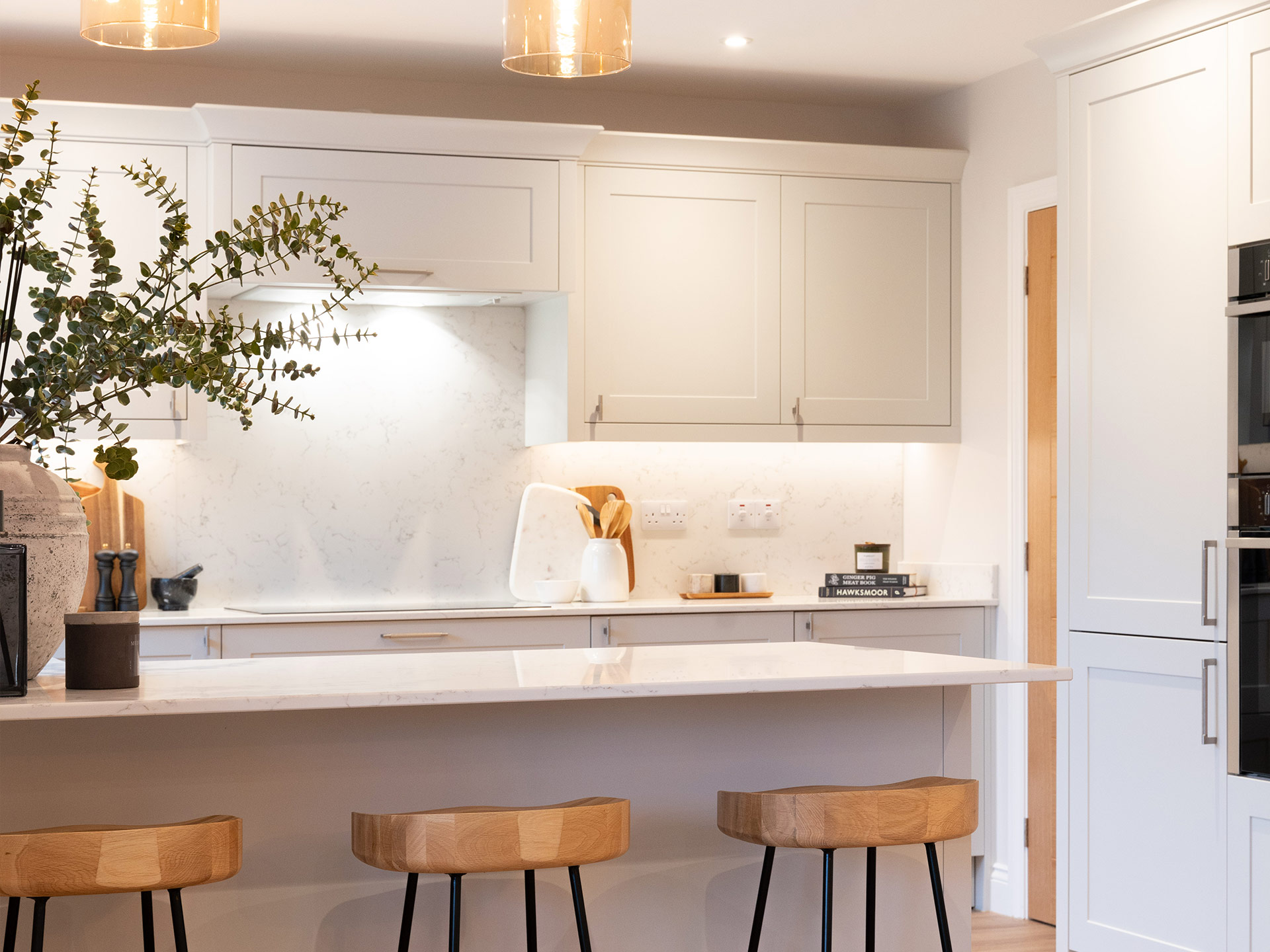◦ Kitchens feature fully integrated NEFF* or Bosch* appliances, painted solid doors, and Quartz* worktops – including full-height splash backs behind the hob, up-stands throughout, and window cills. A wine fridge and under-cabinet LED strip lighting are also included as standard.